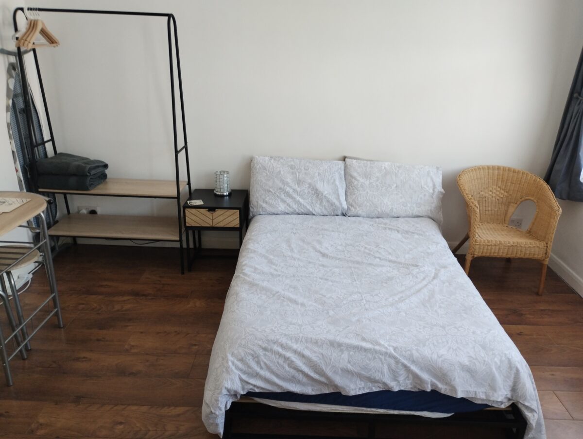 Your own private compact living area with a double bed, kitchenette, comprising double hob, oven-microwave, fridge freezer, sink and work top with extra cupboard space.